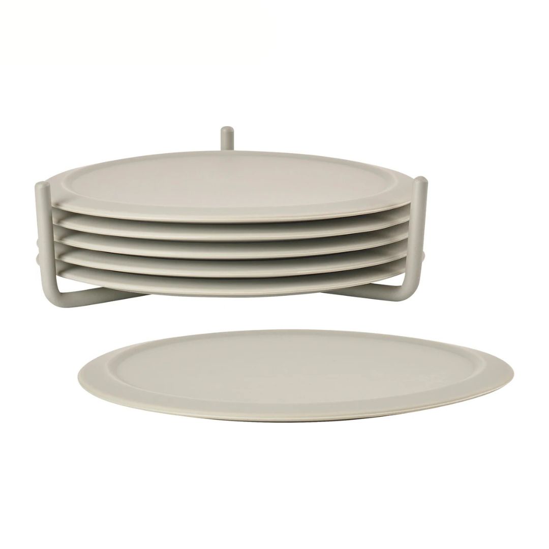 Coasters for your glasses. This set of coasters comes in a set of 6 inclusive stands. The coasters is made of metal and silicon.