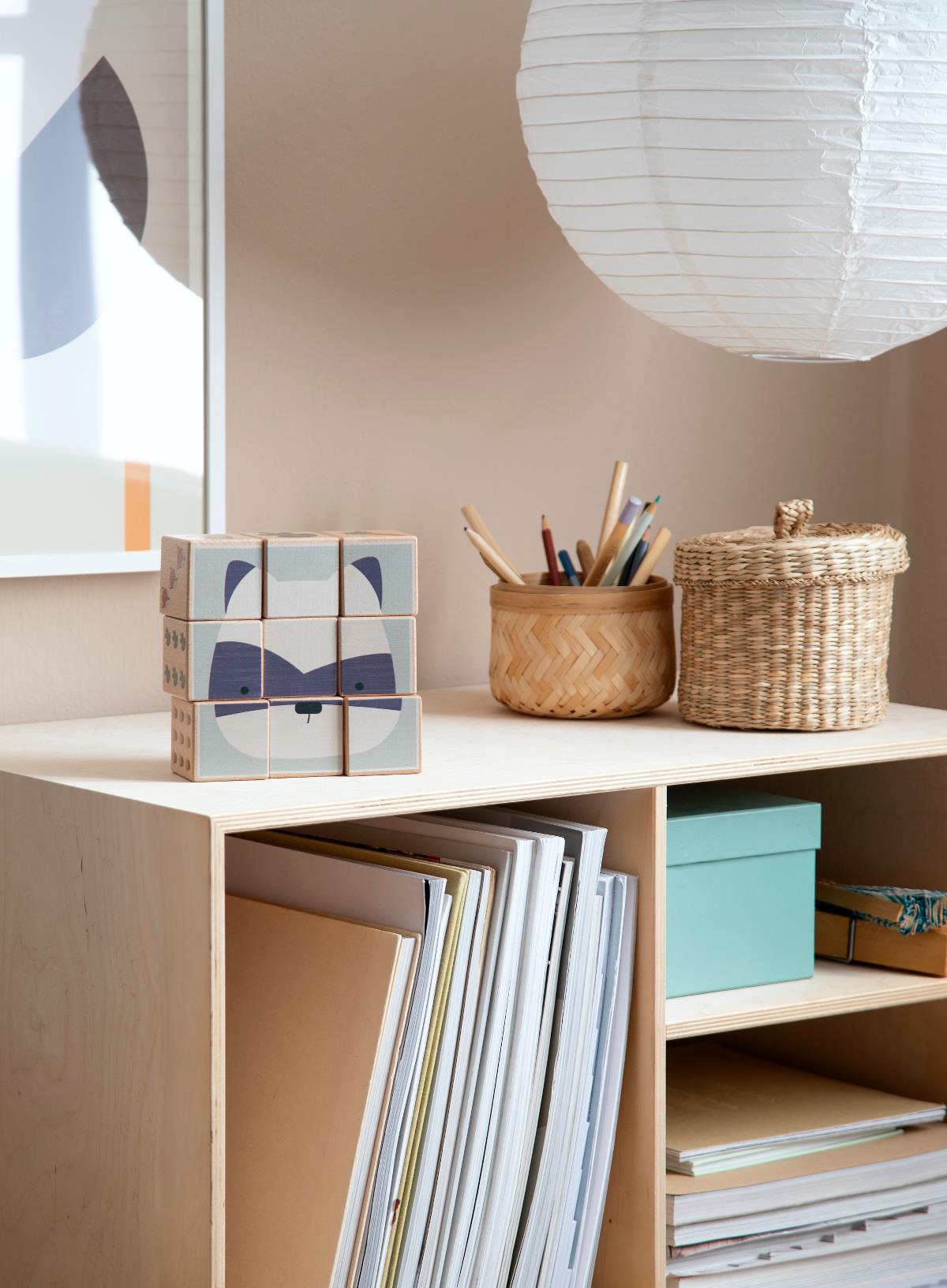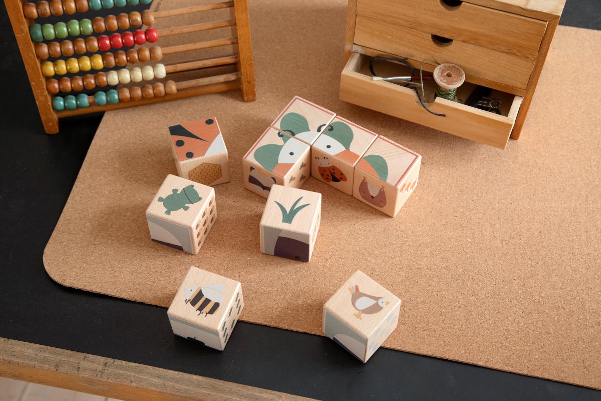 Neun Holzklötzchen mit verschiedenen Seiten, die Kinder erkunden und wie kleine Puzzles zusammensetzen können. Das Puzzle ist Teil der Sebra Woodland Kollektion.